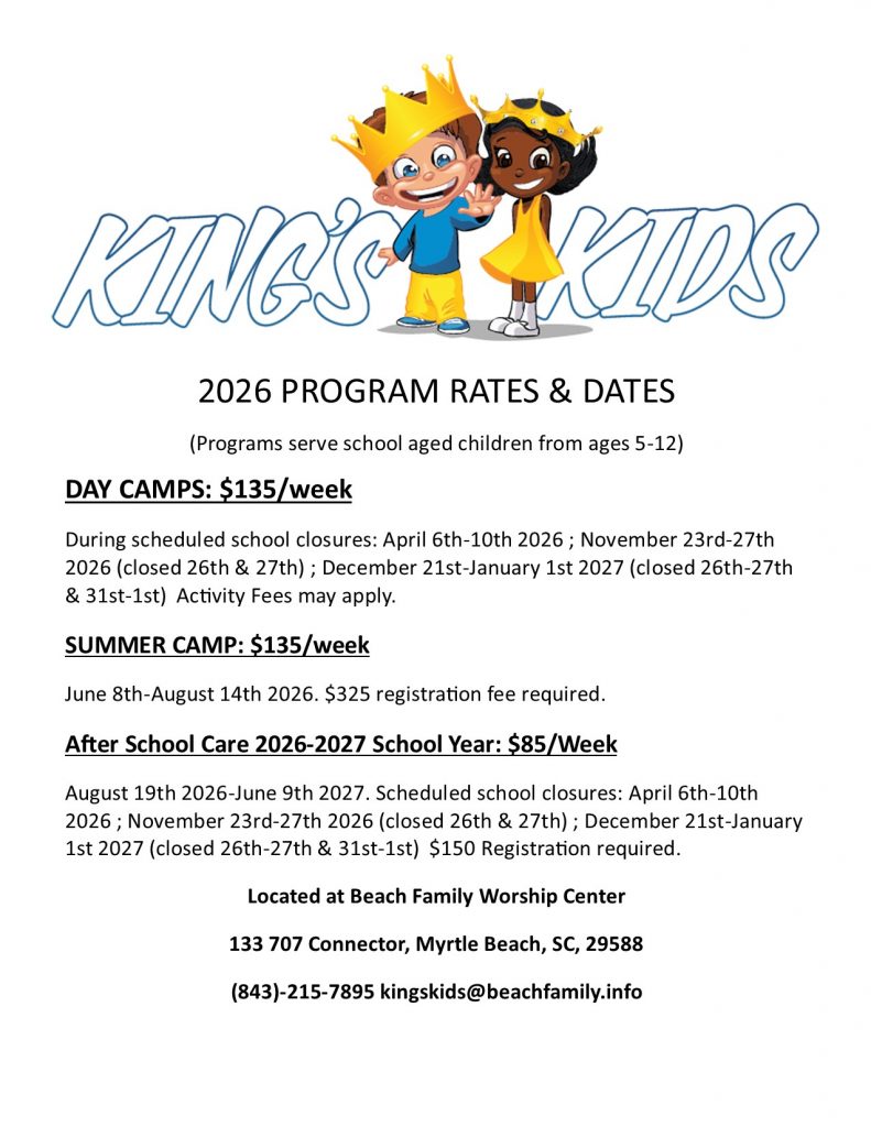 For questions about any of our King’s Kids programs, contact email us at kingskids@beachfamily.info or call 843-215-7895 and ask for Pastor Scott.
